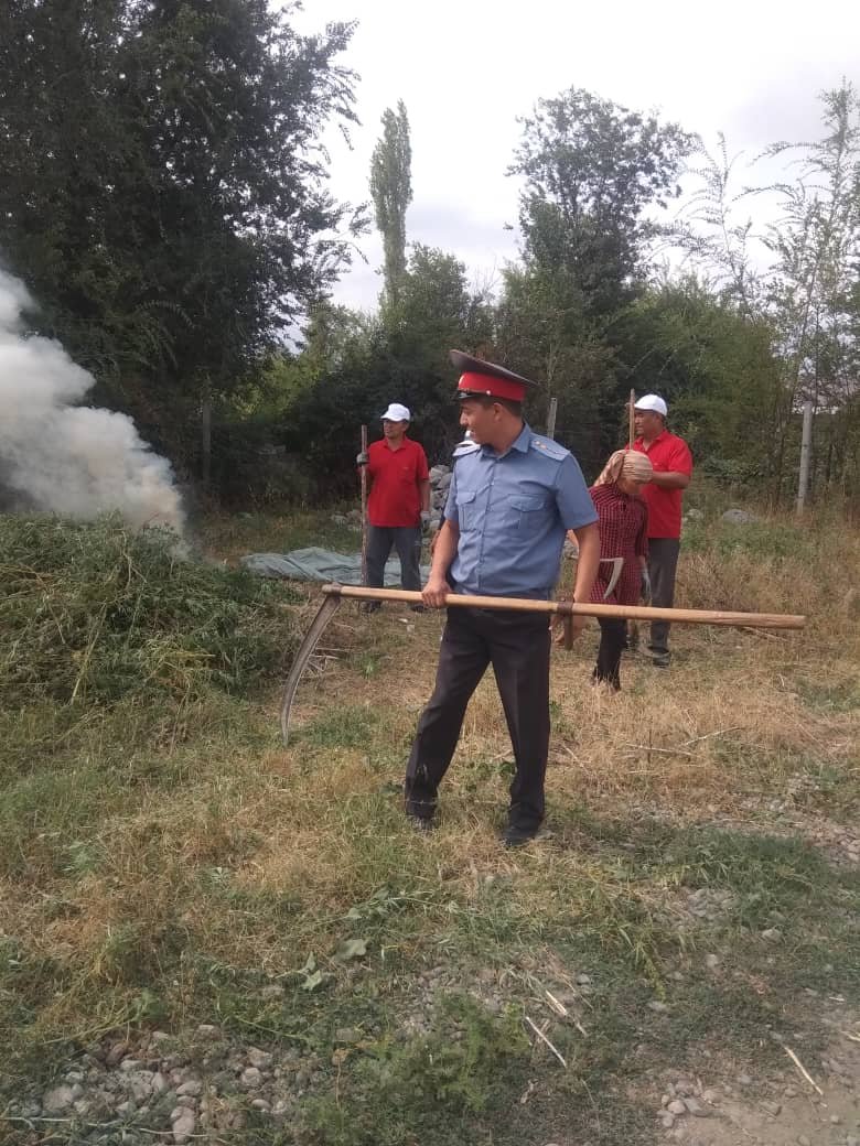 С 12 по 17 августа 2019 года сотрудниками ОВД Аламединского района совместно с местными айыл окмоту, а также местными жителями проведено мероприятия по уничтожению дикорастущей конопли (Кара-Куурай). При проведении мероприятия осуществляли подворный обход, также, обход местностей пораженных дикорастущей коноплей. В ходе рейдовых мероприятий по Аламединскому району было уничтожено дикорастущей конопли площадью 5,1 га, сначала дикорастущую коноплю косили, а затем сжигали. Общий вес уничтожено дикорастущей конопли составило 8290 кг.