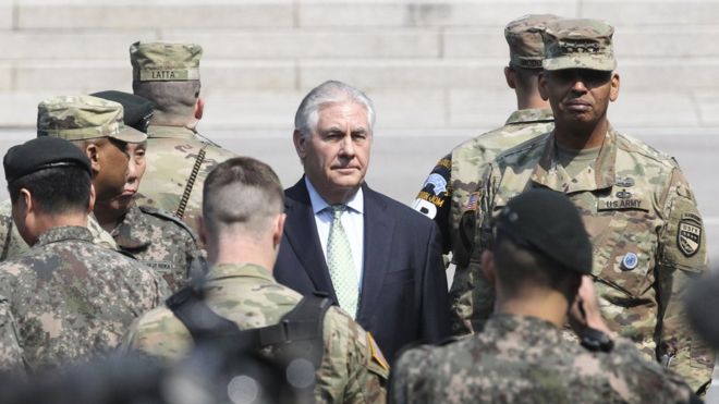 Во время поездки Тиллерсон посетил демилитаризованную зону на границе двух Корей и провел переговоры с главой МИД Южной Кореи Юн Бён Се.