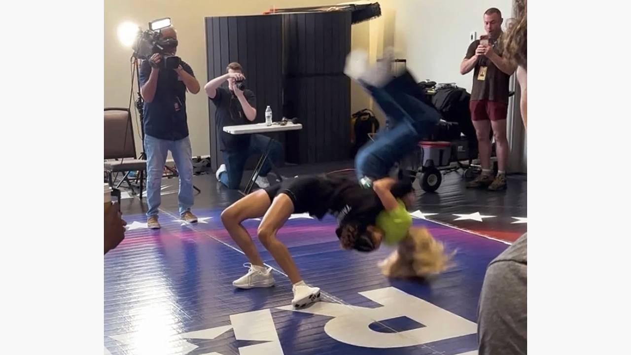 Хорнасек рассказывала о предстоящем крупном мероприятии по вольной борьбе и попросила Блейдс показать на ней ее фирменный бросок с прогиба. Спортсменка схватила телеведущую в области поясницы, перевернула и кинула на пол.