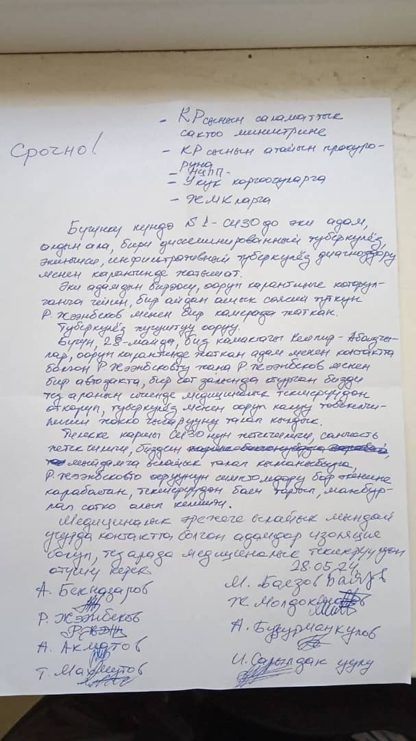«В связи с этим мы вынуждены заявить, что здоровье и жизнь кемпирабадцев, находящихся в СИЗО, подвергаются большой опасности. Зная по личному опыту, что поступающие в СИЗО проходят тщательную проверку на наличие туберкулеза, мы считаем, что Равшан Джеенбеков намеренно подвергается риску заражения опасным заболеванием, и его разместили в одной камере с больным человеком с прямым умыслом причинить Джеенбекову вред. В связи с этим требуем провести расследование данного факта, привлечь виновных к ответственности, а также тщательно обследовать всех обвиняемых, находящихся в СИЗО на предмет заражения», - заявили другие фигуранты дела.
