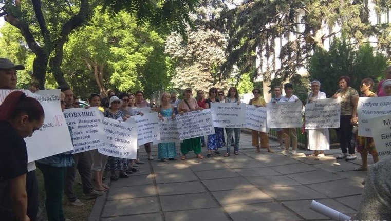 «Проведенный и широко разрекламированный министерством первый пилотный конкурс по отбору директоров школ-интернатов Таласской области был целиком провальным и показал полную несостоятельность инициатив министра Бейшеналиева в кадровом вопросе. Из семи претендентов только один прошел все процедуры конкурса. Широкая общественность не ознакомлена с итогами тестирования, и документацией претендентов», — говорят участники акции протеста.