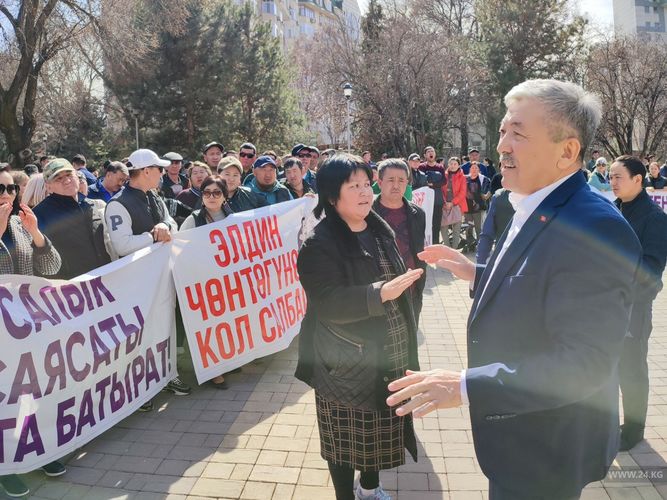 К собравшимся вышел первый заместитель председателя кабинета министров Адылбек Касымалиев. До этого перед участниками акции безрезультатно дважды пытались выступить представители Налоговой службы.Напомним, это не первая акция протеста. 2 марта в Бишкеке в сквере имени Максима Горького митинговали более 500 торговцев рынков и магазинов.