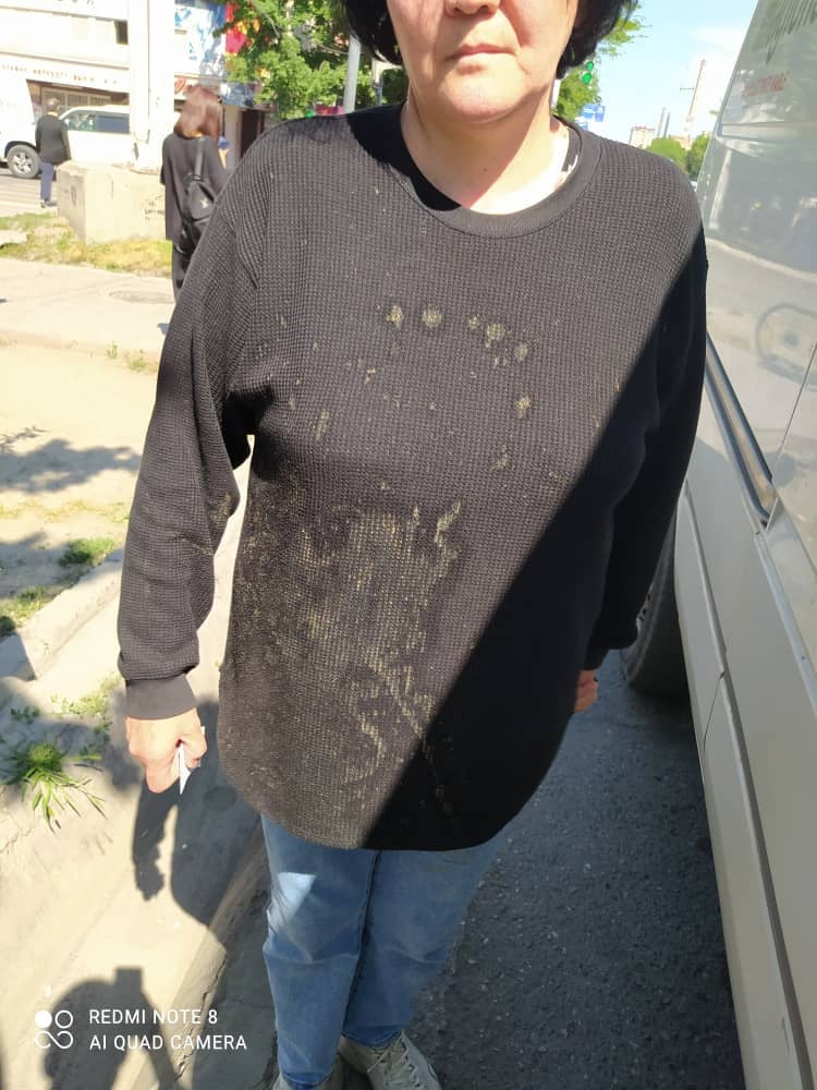 "Я ответила, что не могла сказать про два стакана, так как после медицинской процедуры холодное пить мне нельзя. После этого она стала мне грубить, обзывать меня глухой. Вслед я потребовала ее инициалы и телефон сотрудника, который курирует ее. Она мне в ответ: "Атандын башы. Колунан эмне келет". Тем временем внук выпил напиток, и я хотела закинуть освободившийся стакан в урну, но урны не оказалось. И я оставила стакан на бочке, что посередине. Затем я ушла с внуком в сторону дороги. Как вдруг ощутила в затылке всплеск напитка, она вылила на меня стакан напитка максым. В ярости я взяла кофту и встряхнула ее о бочку. Так она схватила за мои волосы и стала таскать, пинать, царапать, порвала мне футболку. Каково мне было после этого, не передать словами!" - написала возмущенная клиентка.