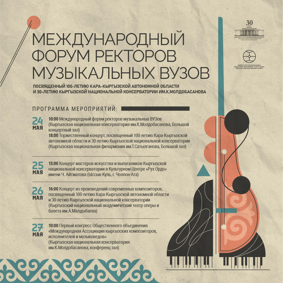 В Бишкеке 24-27 мая состоится первый международный форум ректоров высших музыкальных учебных заведений, посвященный 100-летию Кара-Кыргызской автономной области и 30-летию Кыргызской национальной консерватории имени Калыя Молдобасанова.