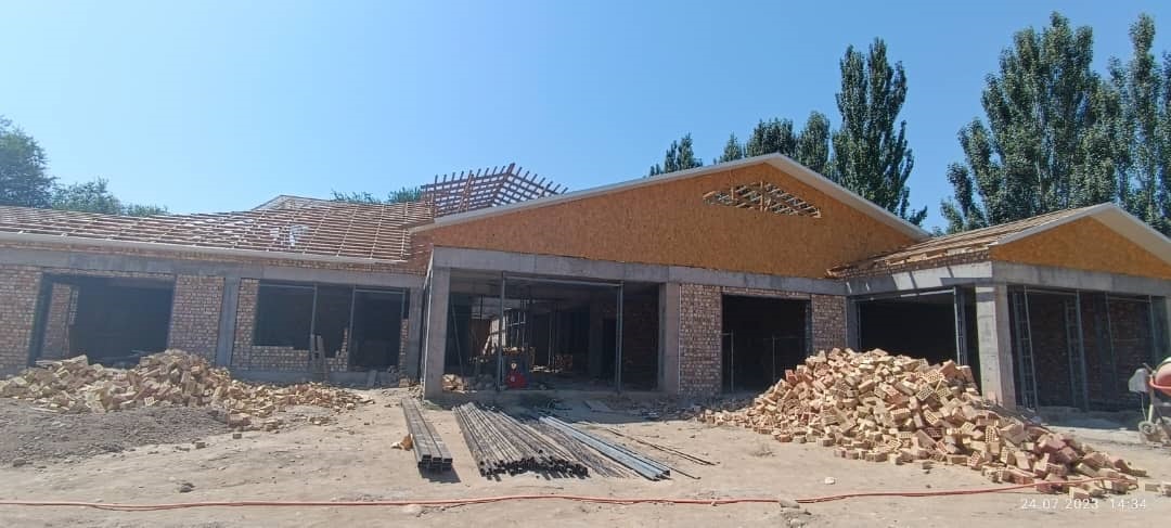 В настоящее время закончены работы по устройству железобетонного каркаса, продолжаются работы по кладке кирпича и кровли крыши. Подрядной организацией выступает ОсОО «Бай Мен».