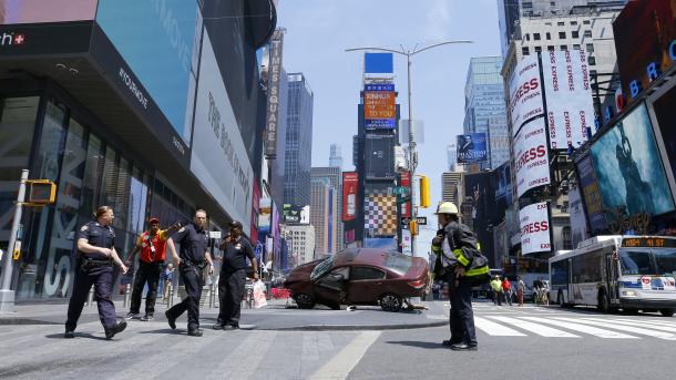 В Нью-Йорке автомобиль на большой скорости врезался в толпу пешеходов, в результате чего один человек погиб и свыше 10 получили ранения. Автомобиль остановился, врезавшись в барьер.