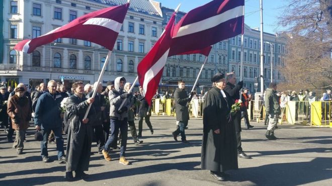 "Мы протестуем против прославления нацистской организации. Они (участники шествия) ее чтят. Они думают, что те воевали за Латвию, но на самом деле они воевали за Германию и Холокост. Это скандал", - заявила Русской службе Би-би-си немецкая антифашистка Анна Ванненга.