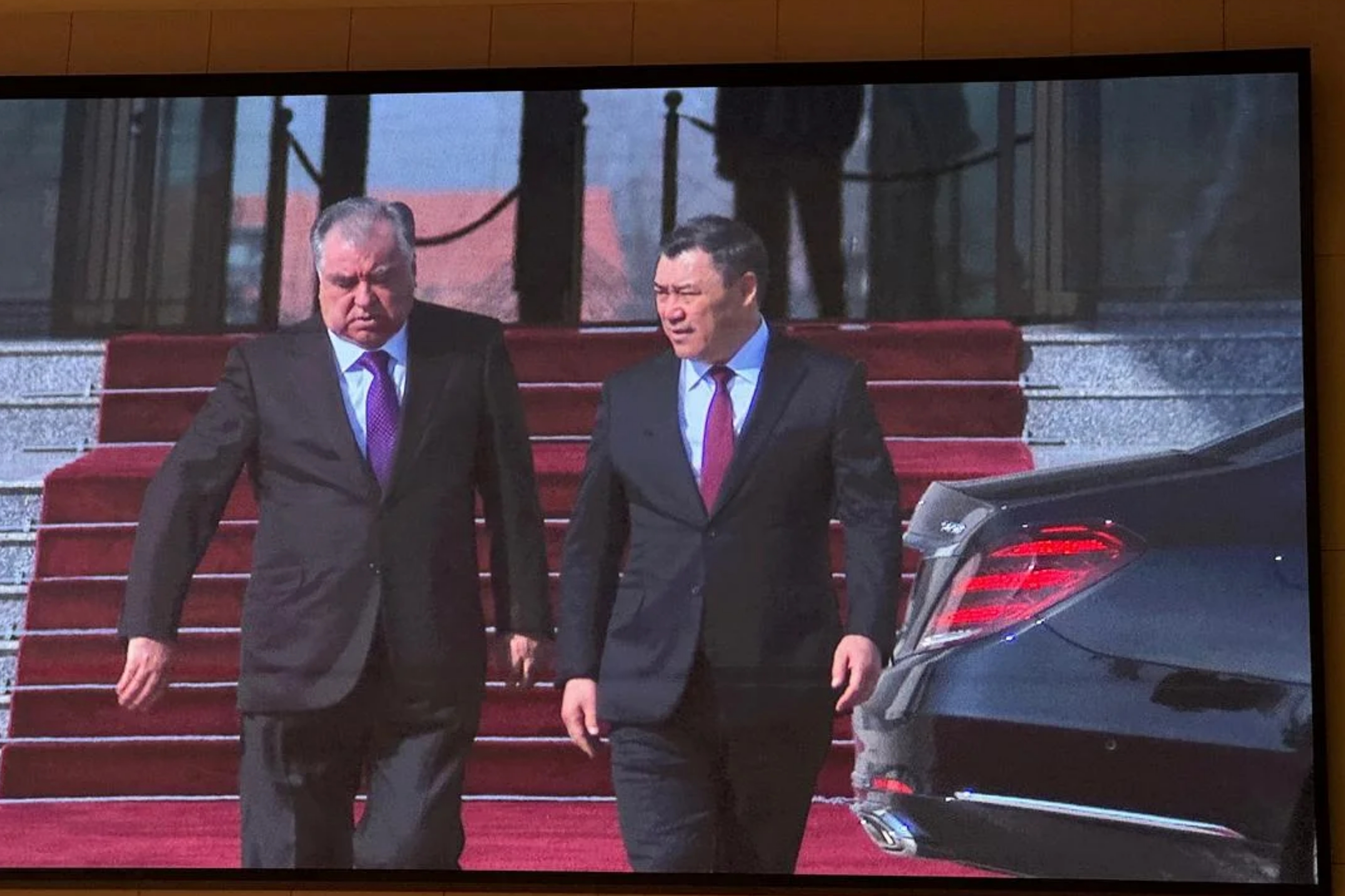 На флагштоках здания вывешены государственные флаги Кыргызстана и Таджикистана, выстроен почетный караул, этновоины и расстелены ковровые дорожки.