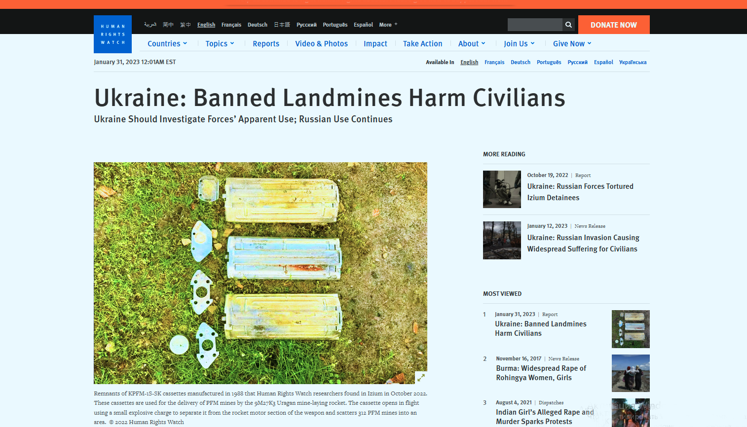 – Human Rights Watch обвинил ВСУ в использовании запрещенных противопехотных мин в Изюме и вокруг него, когда эти территории были оккупированы Россией. Украинский омбудсмен Лубинец отметил, что HRW в своём отчёте указали карту Украины, на которой Крым обозначен как часть России – https://t.me/u_now/84429