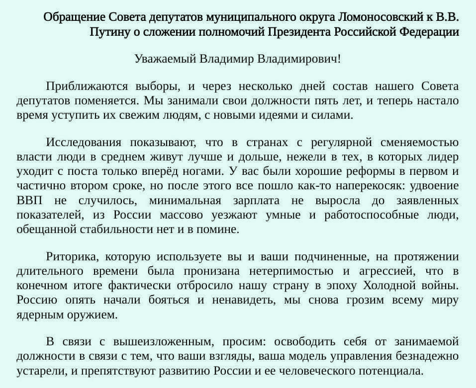 – Совет депутатов Ломоносовского округа Москвы обратился с призывом к Путину уйти в отставку: «Просим: освободить себя от занимаемой должности в связи с тем, что ваши взгляды, ваша модель управления безнадежно устарели, и препятствуют развитию России и её человеческого потенциала» – https://t.me/chtddd/54205 и https://t.me/novaya_europe/5867