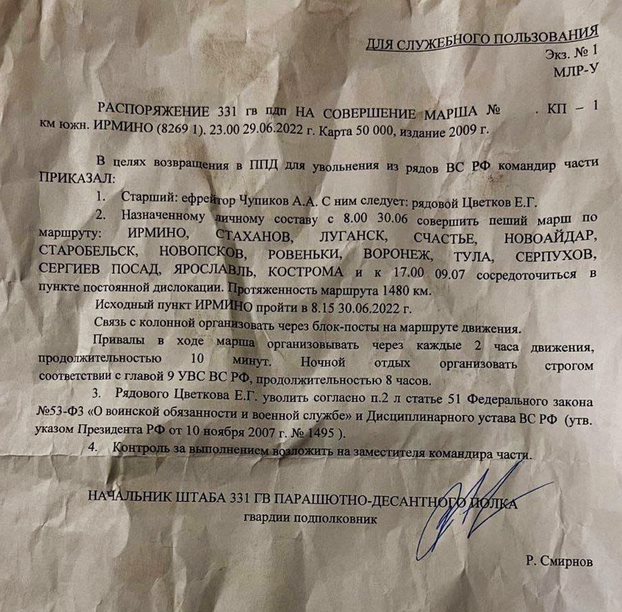 – В распоряжении InformNapalm оказалось распоряжение «отказникам» 331 гвардейского парашютно-десантного полка пройти 1480 км пешим маршем в пункт постоянной дислокации – только там их уволят из рядов вооруженных сил РФ – https://t.me/uniannet/71383