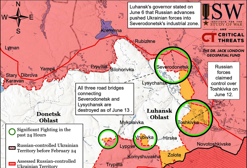 – Глава Луганской обладминистрации Гайдай: Центр Северодонецка перешел под контроль армии РФ, но город не заблокирован и часть районов остается под украинским контролем. Однако разрушены все мосты, ведущие в город, в связи с чем невозможны эвакуация и подвоз гуманитарных грузов – https://ru.euronews.com/2022/06/13/ukraine-severodonetsk-center-under-russian-army-control