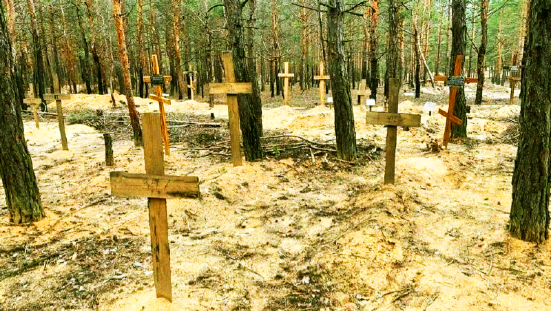 – На окраине Изюма обнаружено более 440 могил, из них лишь менее 25 принадлежит военным. Имён на табличках почти нигде нет. Возможно, там похоронены тела из-под завалов разбомбленных домов, которые ещё предстоит идентифицировать – https://t.me/UAonlii/37415?single и https://t.me/uniannet/72272?single