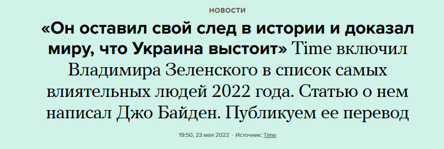 – Зеленский вошел в число 100 самых влиятельных людей издания Time. Текст о нём написал Байден: «У народа Украины – лидер, достойный их храбрости и устойчивости, поскольку граждане борются за свои дома и свою свободу. Народы мира, вдохновленные примером Зеленского, стали более сплочёнными, решительными и целеустремлёнными, чем когда-либо» – https://t.me/c/1399753118/3655