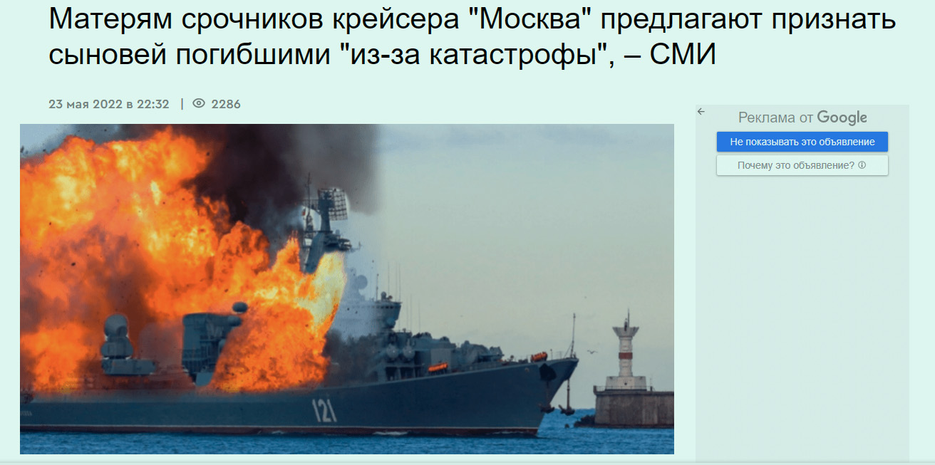 – «Новая газета. Европа»: Родителям срочников с потопленного украинцами российского крейсера «Москва» предлагают подписать заявления, что их сыновья «умерли в результате катастрофы» – https://t.me/uniannet/56542