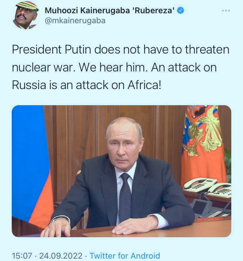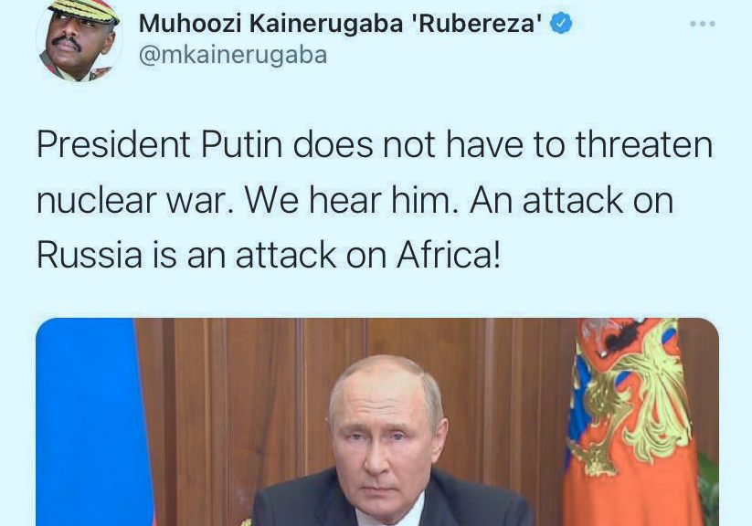– Сын президента Уганды, командующий сухопутными войсками Мухузи Кайнеругаба: «Президенту Путину не нужно угрожать ядерной войной. Мы слышим его. Нападение на Россию – это нападение на Африку!» – https://t.me/Politkrem/15306