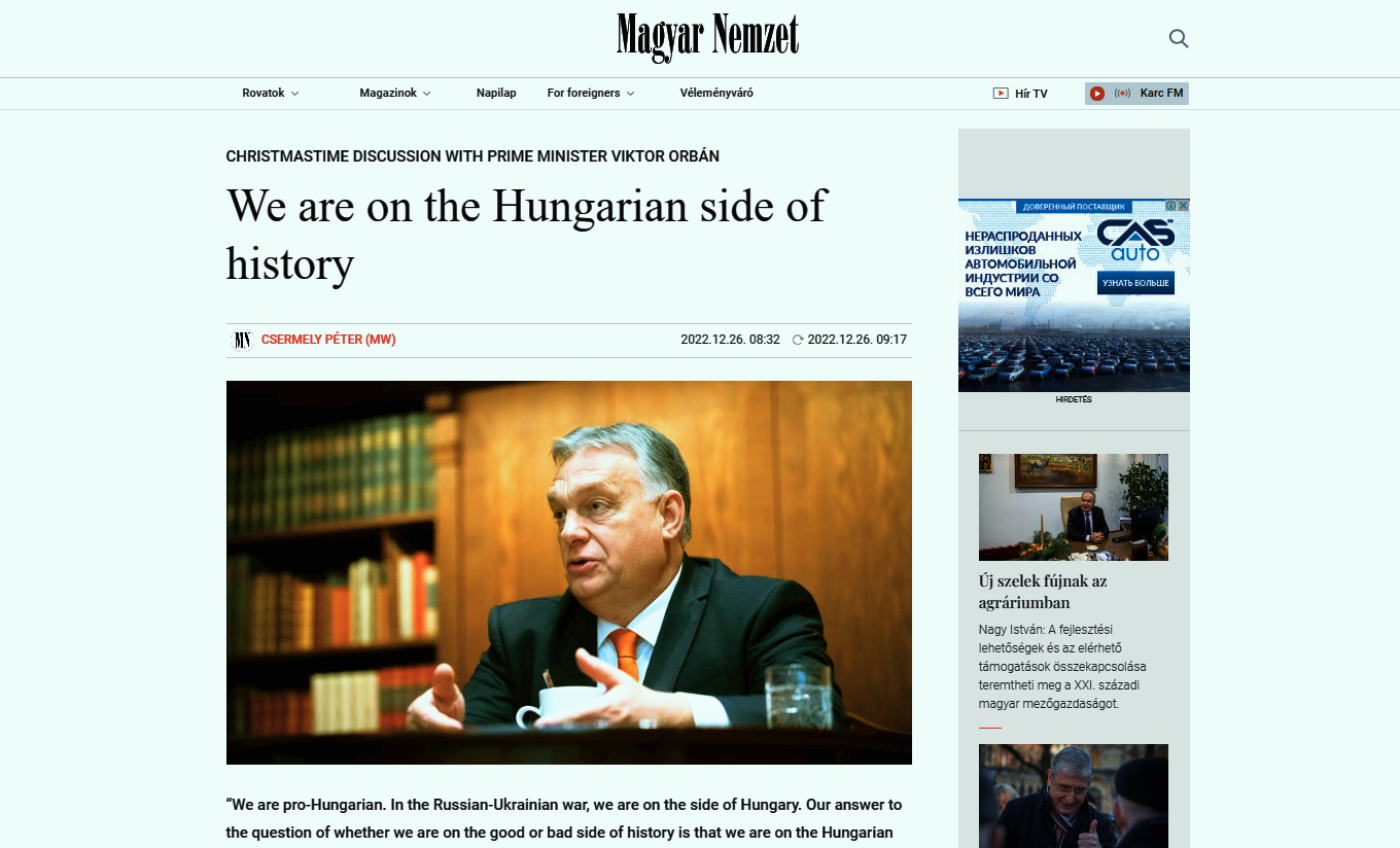– Премьер Венгрии Орбан в интервью Magyar Nemzet: «Украина может воевать только до тех пор, пока США поддерживают их деньгами и оружием. Если американцы хотят мира, то мир будет». Венгрия остаётся «провенгерской», но «поддерживает и помогает Украине», так как заинтересована «в выживании суверенной Украины и в том, чтобы Россия не представляла угрозы безопасности Европы» – https://t.me/u_now/80428