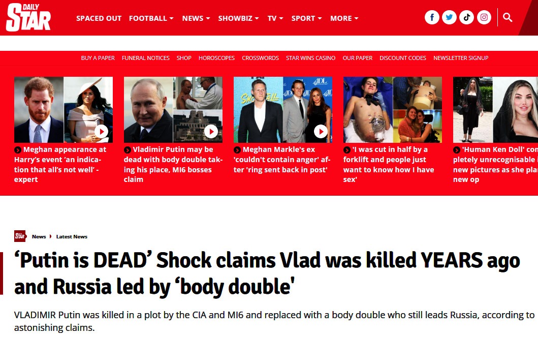 – Сразу четыре британских таблоида – Daily Star, Express, The Sun и Mirror – написали о смерти Путина. В Кремле якобы используют двойников: одного задействовали на параде 9 мая. Все недавние выступления Путина – это «консерва», пишет Daily Star – https://t.me/chtede/50062