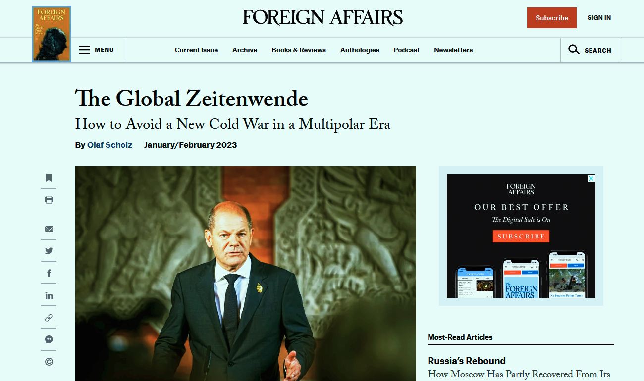 – Олаф Шольц в журнале Foreign Affairs: «В мире наступает переломный момент, эпохальный тектонический сдвиг. Агрессивная война России против Украины положила конец предыдущей эре. Новые силы формируются и возрождаются, в том числе экономически сильный и политически уверенный в себе Китай» – https://t.me/novaya_europe/11028