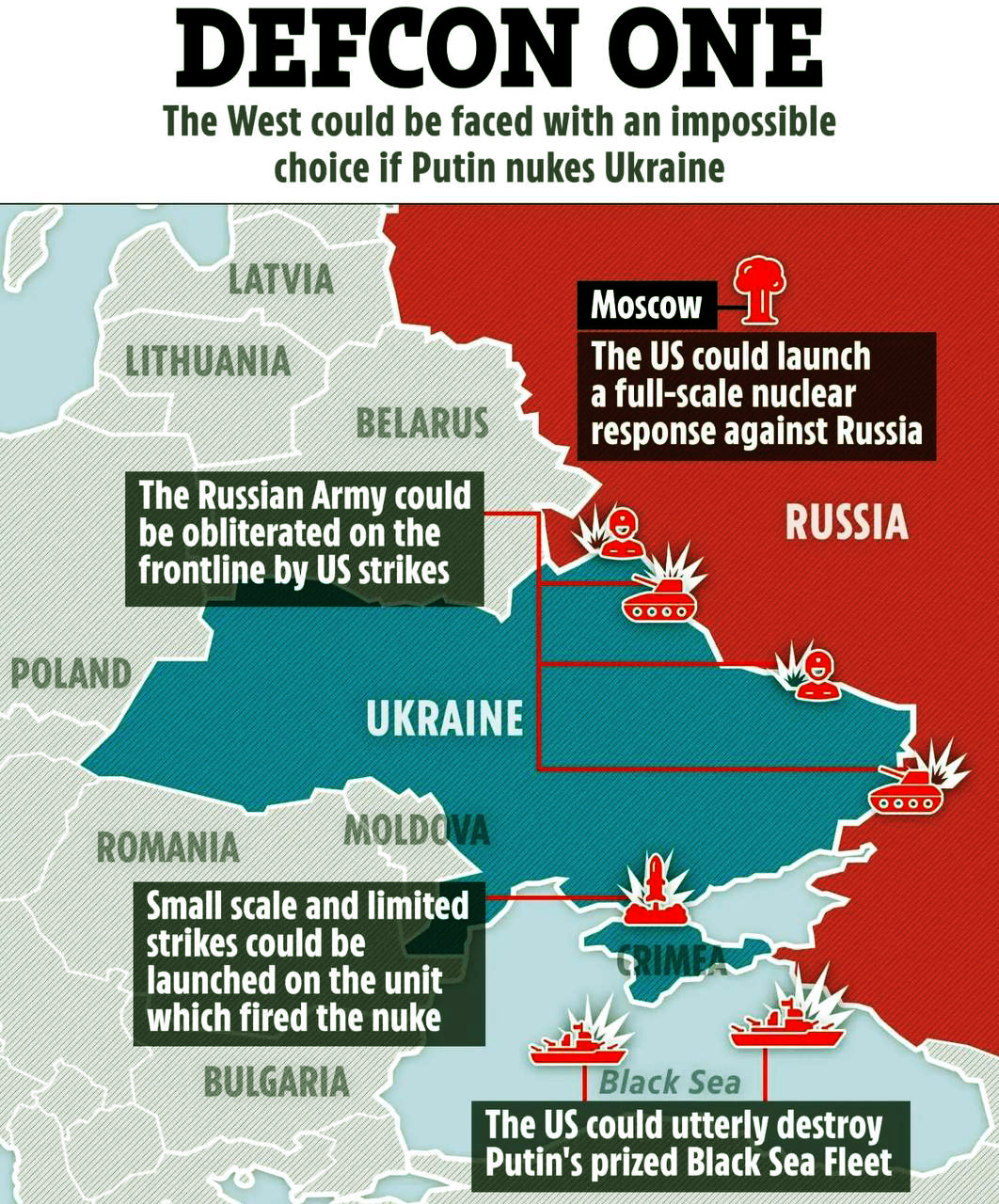 – The Sun: Четыре сценария, как Штаты могут ответить на применение Россией ядерного оружия в Украине – 1) Ядерный удар по России, в том числе по Москве; 2) Удар по российским войскам на линии фронта в Украине; 3) Ограниченный ядерный удар по Крыму; 4) Удар по Черноморскому флоту РФ – https://t.me/voynareal/37434