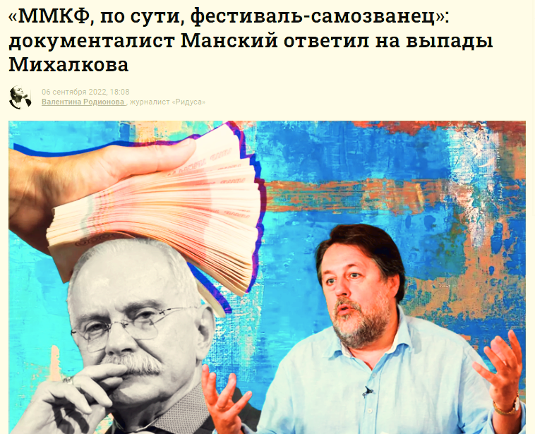– На режиссёра Манского возбудили уголовное дело о клевете по заявлению Никиты Михалкова, а свидетелем проходит Ксения Собчак. Манский рассказал в мае в интервью Собчак о коррупции на Московском международном кинофестивале: «Фестиваль стоит 15% от тех сумм, которые он получает от государства» – https://t.me/chtddd/54070