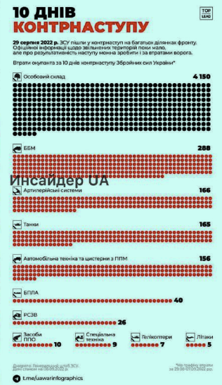 – Insider UA: В течение 10 дней после начала украинского контрнаступления 29 августа уничтожено 4 тысячи российских военнослужащих – https://t.me/insiderUKR/40749