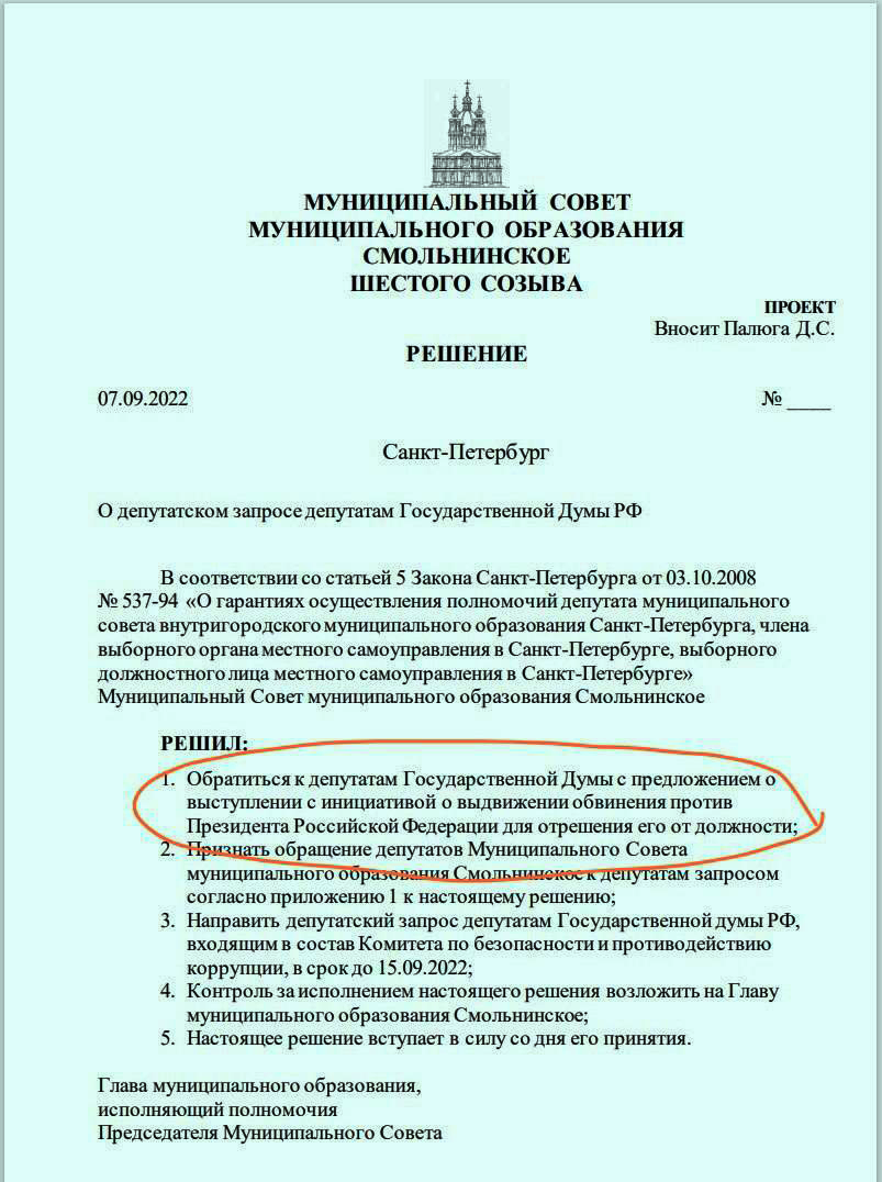– Совет муниципального образования «Смольнинское» Санкт-Петербурга обратился к депутатам Госдумы с просьбой выдвинуть обвинение в госизмене против Путина, так как с 24 февраля «уничтожаются боеспособные подразделения армии РФ, гибнут и становятся инвалидами молодые трудоспособные граждане», «страдает экономика России», а «блок НАТО расширяется на Восток» – https://t.me/uniannet/71293 и https://t.me/novaya_europe/5791