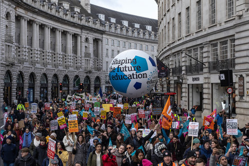 Шествие организовали члены Национального профсоюза образования (NEU) 1 февраля. Люди прошлись от Портленд-плейс, что в центральной части города, до Вестминстера. Граждане, участвовавшие в шествии, выступали против нового закона о минимальном уровне работы основных служб во время забастовок и за увеличение заработной платы. Они требуют повышения зарплаты в соответствии с инфляцией, которая в прошлом году превысила 10%.