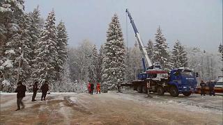 В Подмосковье спилили главную новогоднюю ель России. Она украсит Соборную площадь Московского Кремля. Из 35 хвойных конкурсанток было выбрано 90-летнее дерево, найденное в деревне Новопареево городского округа Щёлково. Вечером 16 декабря на специальном автопоезде ель доставят в Кремль.