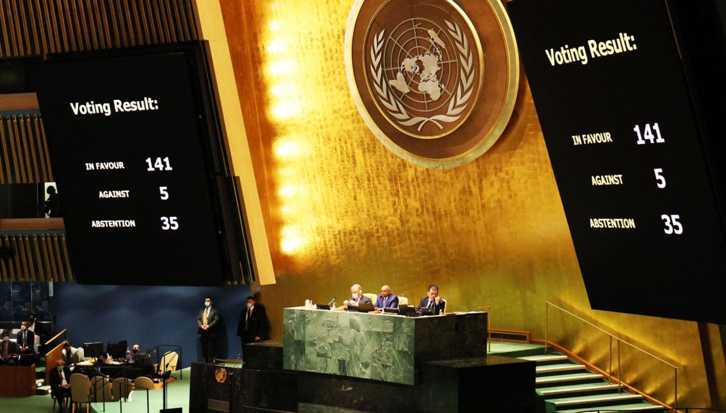 Вчера вечером Генеральная ассамблея ООН постановила, что Россия должна «немедленно, полностью и безоговорочно» вывести свои войска с территории Украины и «немедленно и безоговорочно отменить» своё решение по Донецкой и Луганской республикам. 25 февраля вопрос рассматривался на Совете безопасности ООН и Россия наложила на решение вето, поэтому резолюция «Агрессия против Украины», была вынесена на Генассамблею.