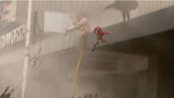 Женщина бросила ребенка в толпу, стоявших с вытянутыми руками, в тот момент, когда вокруг нее уже клубился дым. Ребенок остался невредимым и позже его отдали матери.