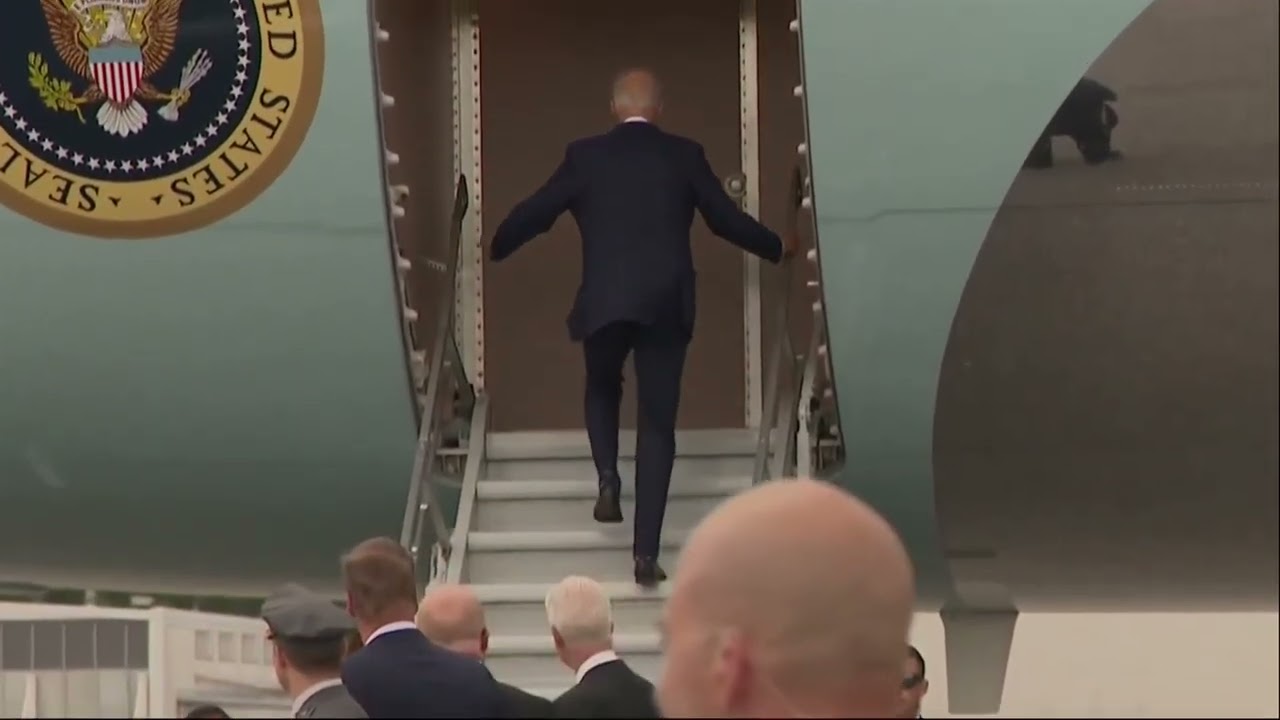 На опубликованных кадрах видно, как 80-летний президент США, вылетая из Хельсинки, использовал короткий трап, однако все равно споткнулся и даже приготовился упасть.