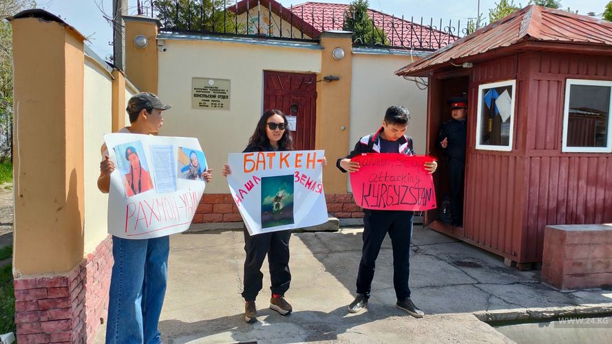 Возле посольства Таджикистана в Бишкеке проходит акция протеста против агрессии. На месте собрались 20 человек. Они призывают Таджикистан прекратить агрессию в Баткенской области. Участники держат плакаты с надписями: «Баткен — наша земля!», «Стоп, Рахмон, агрессор».