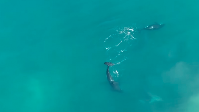 Беспилотник запечатлел, как группа косаток разделилась: пара из них проследовала на восток в сторону устья местной реки - известного места активности акул.