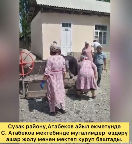 В Сузакском районе Джалал-Абадской области учителя решили своими силами построить школу. Об этом сообщают каналы в социальных сетях. На снятых кадрах женщины месят бетон и носят камни. На заднем фоне видны свежие постройки. Авторы утверждают, что запись была сделана в селе имени Атабекова. Это небольшой населенный пункт, расположенный на самой границе с Узбекистаном.