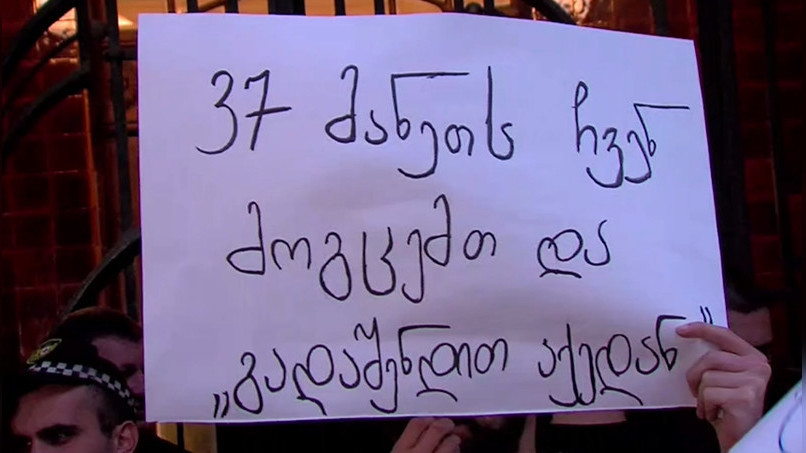 В акции, проходившей у здания грузинского МИД, участвовало порядка 50 человек. Участники митинга вышли на улицу с плакатами с критикой российской власти и руководства Грузии.