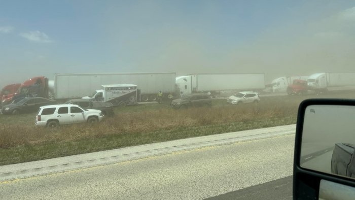 Причиной аварии стал сильный ветер, который сдул почву с фермерских полей. В результате началась песчаная буря, что привело к нулевой видимости на шоссе.
