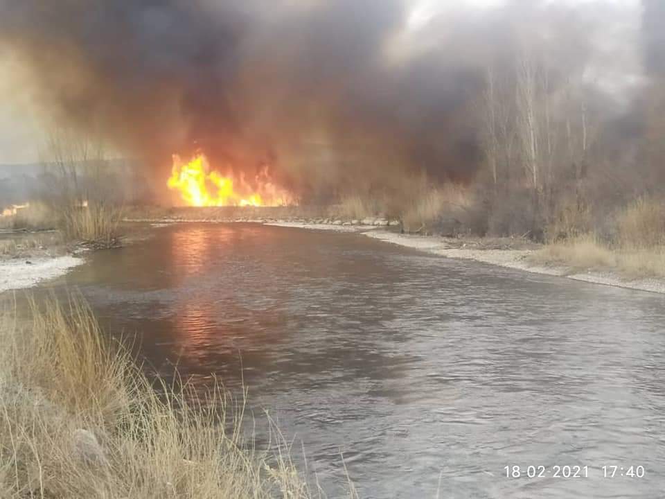 По предварительным данным, в 18:39 поступил вызов о том, что на 51 км трассы Бишкек—Нарын—Торугарт произошло возгорание камыша. Огонь начал приближаться к заправке Brent.