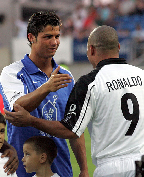 Криштиану Роналду и Роналдо – люди из разных эпох, хотя бразилец старше тезки всего на 8 лет. Сейчас Роналдо президентствует в «Вальядолиде», а Криштиану зажигает в «Ювентусе» – пока они не пересеклись. И в официальных матчах друг против друга никогда не играли.