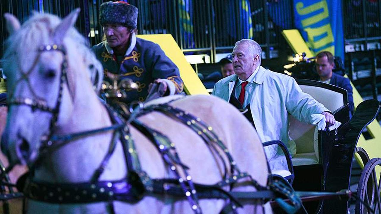 На заключительный предвыборный съезд ЛДПР лидер партии Владимир Жириновский приехал в коляске, запряженной тройкой лошадей, сообщает РИА «Новости».