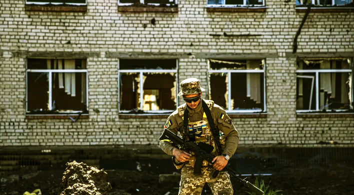 Украинский военный возле разрушенного здания школы в Харькове © Metin Aktas / Anadolu Agency / Getty Images