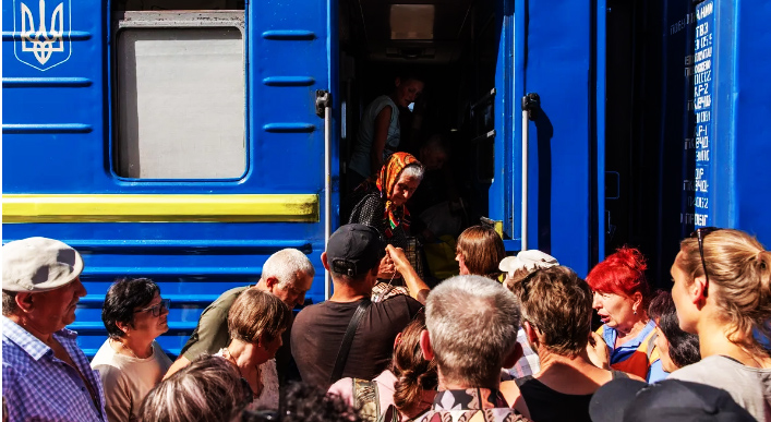 Мирные жители садятся в эвакуационный поезд в Покровске. Июль 2022 года. © Alex Chan Tsz Yuk / SOPA Images / LightRocket / Getty Images
