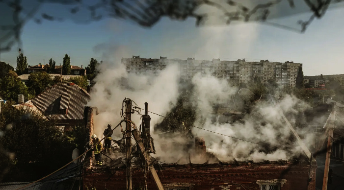 Пожарные пытаются потушить возгорание в обстрелянном доме в Бахмуте, Украина, 30 июля 2022 года. © Diego Herrera Carcedo/Anadolu Agency via Getty Images