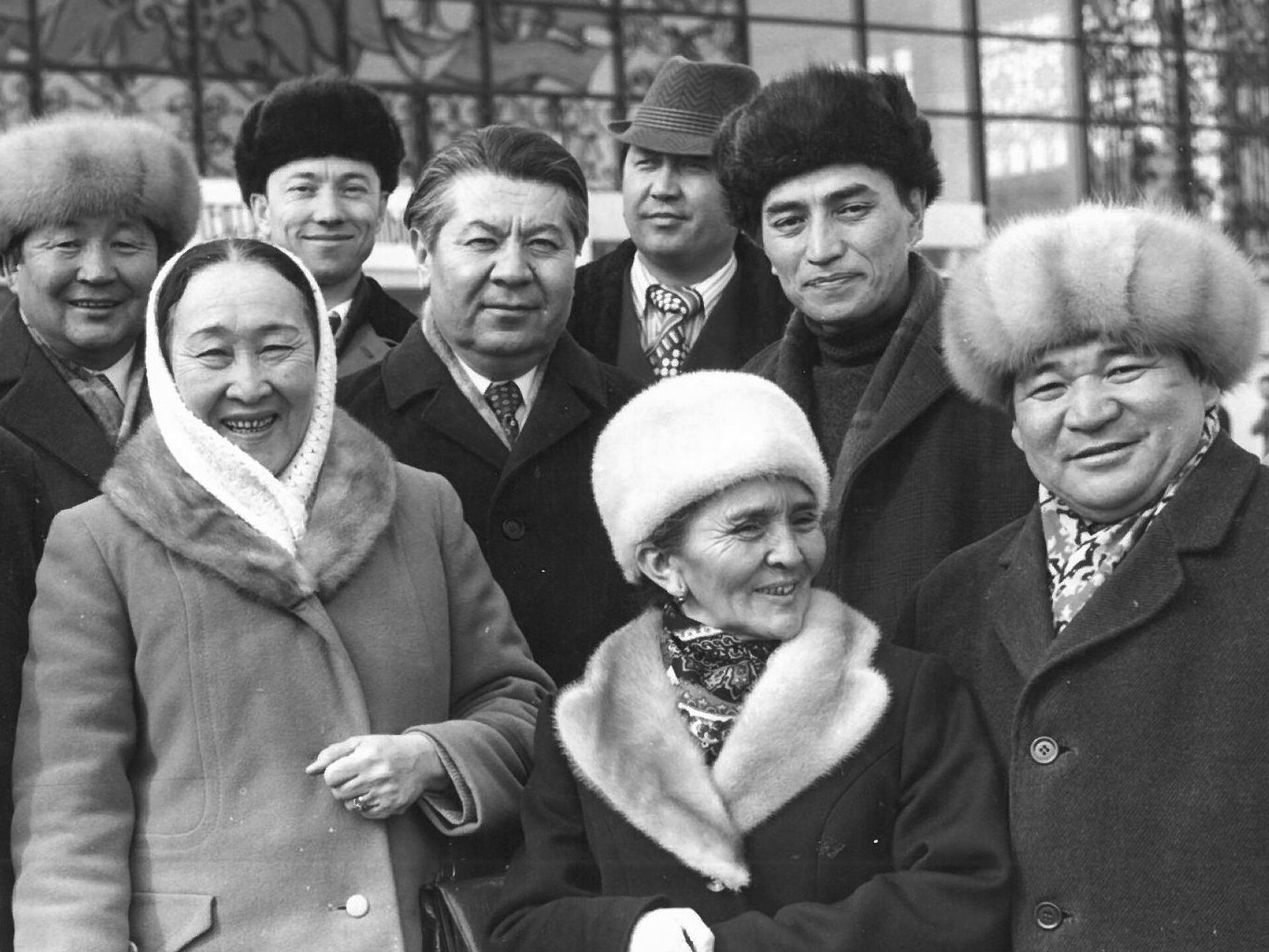 Слева направо в первом ряду стоят известная актриса Даркуль Куюкова, народная артистка КР Сабира Кумушалиева и народный артист КР, акын-импровизатор Эстебес Турсуналиев.